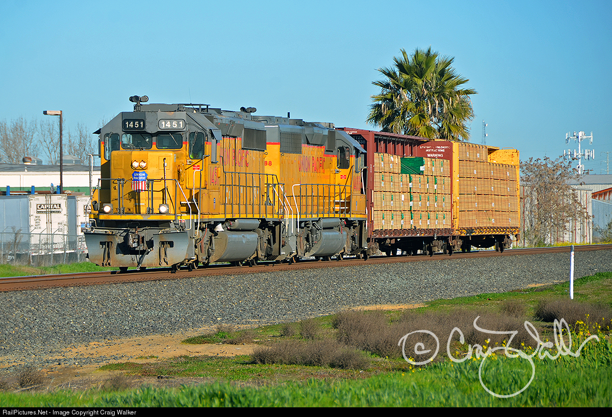 A Union Pacific local heads south through Sacramento, California, behind a pair of GPs: UP GP40-2 1451 (the former Southern Pacific 7676) and GP40 1488 (ex-SP 7118, originally Baltimore & Ohio 4049). At this point the train consists of only two centerbeam cars loaded with lumber. (February 19, 2018)