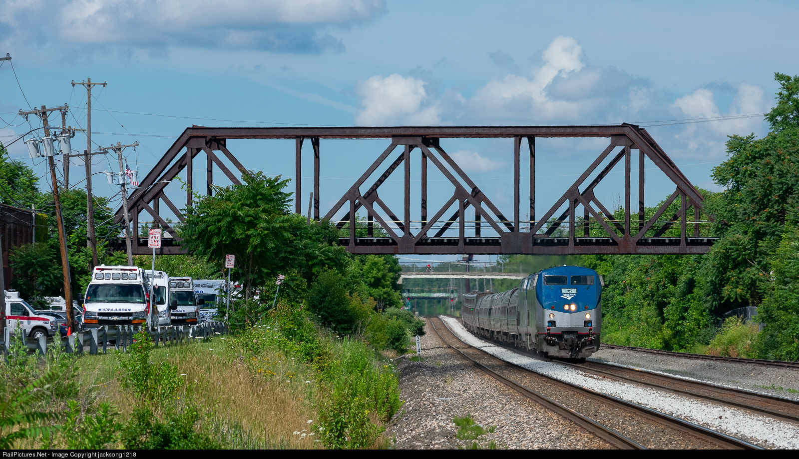 On a beautiful July 15th morning, the EB Amtrak Lake Shore Limited is running about 30 mins late due to track work at CP 373 in Rochester. The train was running behind 2 Q trains this moring, which bottled up the one main that was open. The train is seen here passing under the RS line at MP 374. On the left of the frame is AMR ambulance, which now occupies the old General Railway Signal building.