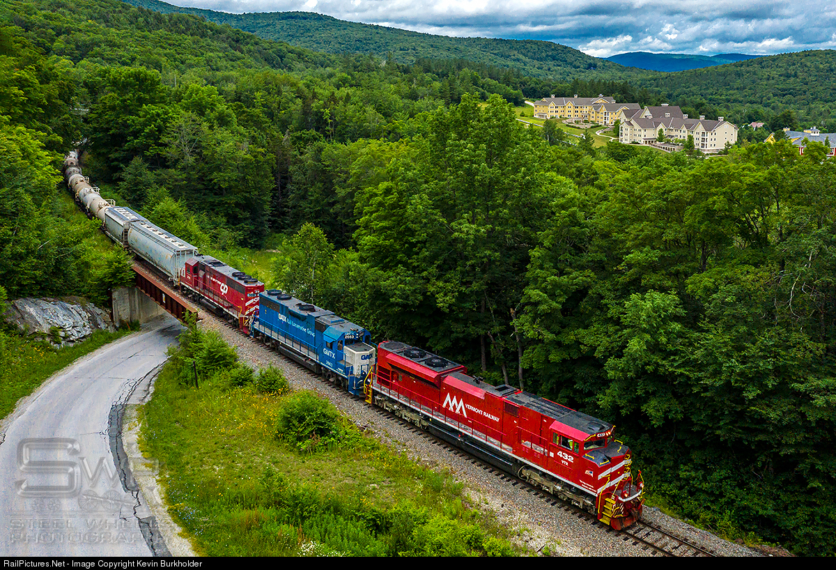 After being out of service for nearly a year, the Vermont Railway SD70M-2 432 has returned to service following various mechanical repairs, including a main generator replacement. Leading train GMRC 263, the 432 has GMTX GP38-2 2663 and CLP GP40-2 306 as it heads downgrade into Ludlow, Vermont, with 40 cars in tow.