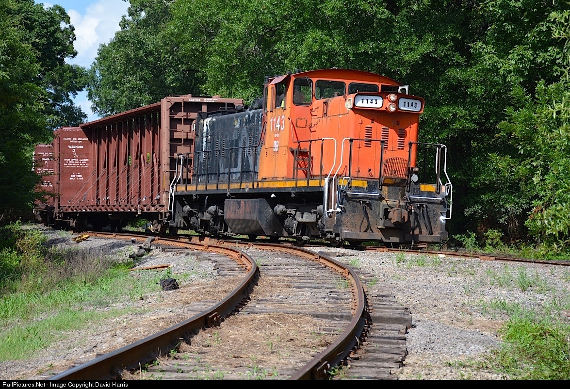 | Dinosaur 1143 brings a half-dozen cars around the curve just outside the yard at North Dardanelle. The GMD-1 was built in Canada, and spent 40 years there before heading to Arkansas to put in another twenty - and counting. |