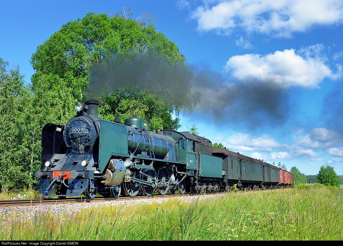 Known as ”Ukko-Pekka”, the Pacific locomotive #1009 of the Hr1 class was the most powerful passenger type of steam engine to be used in Finland. A total of twenty-two were constructed by the Lokomo and Tampella workshops between 1937 and 1957 to meet the demand of heavier and faster expresses that were getting beyond the capacity of the earlier 4-6-0 passenger engines. The two Ukko-Pekka prototypes (#1001 and 1002), ordered by the Finnish State Railways from Lokomo of Tampere, were massive in comparison to older types of engine. Four more (#1000/03/04/05) were added in 1939 and 1940, then a batch of six (#1006-11) in 1948 and 1949, and eight others (#1012-19) in 1955. The final two (#1020-21), built in 1957, were fitted with roller-bearings and represented advanced steam locomotive technology. The twenty-two Pacifics formed the backbone of motive power serving the heavy rail tracks in southern Finland until 1963 when they were gradually replaced by diesels. Two of the Ukko-Pekka Pacifics are presently kept in working condition in Finland, #1021 owned by Finnish State Railways, and the #1009. #1009 is representative of production during shortages in the aftermath of the war, it’s number plates and cab numbers being aluminium instead of brass. In every other way the engine is typical of its class. The engine was restored to working order and passed for mainline running in 1993 when under the ownership of Nigel Sill from London who financed and directed the undertaking. The maiden passenger journey took place on 22 May 1993 – a return working from Pieksämäki to Joensuu. #1009 is presently stabled in Kouvola. Source: Höyryveturimatkat 1009 Oy Internet homepage.