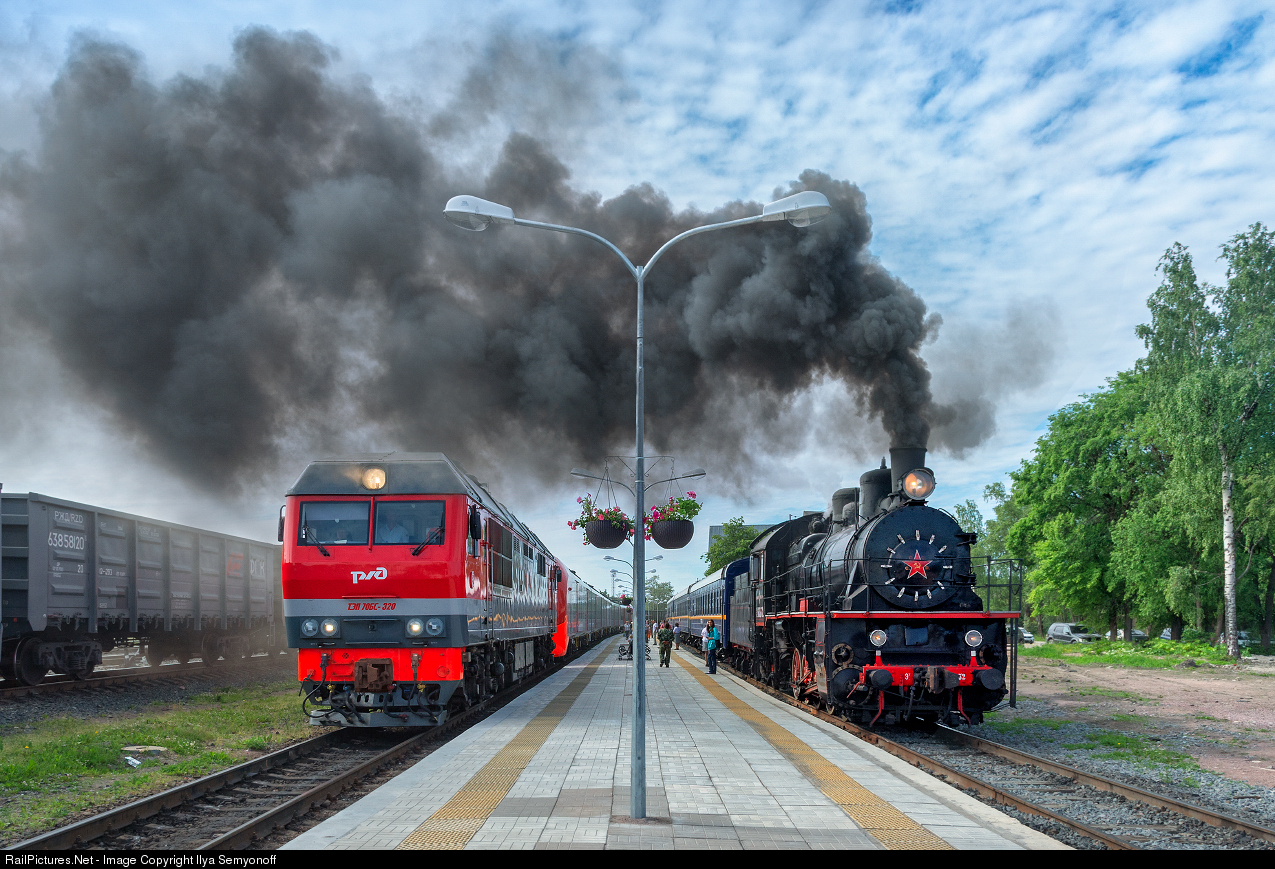 TEP70BS diesel engine with passenger train from Saint Petersburg arrives at Sortovala station. Near right a Soviet steam engine with tourist passenger train ready to start at Ruskeala park. (Karelia Republic). That train runs regularly every day on this route until the end of the summer. This project is a part of the strategy of Russian Railways (RZD) in order to preserve the historical heritage of the Russian railways...