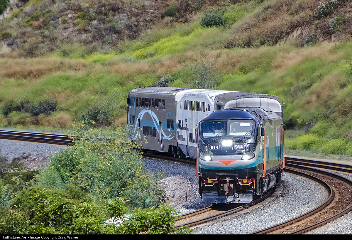 Metrolink train 802 passes through Santa Ana Canyon as it heads from Laguna Niguel/Mission Viejo to San Bernardino (Downtown) on May 20, 2019. Metrolink is the only owner (so far) of EMD's latest F-unit, the F125. And one of them, number 914; is on the point of this 4-car train. (Yorba Linda, California)