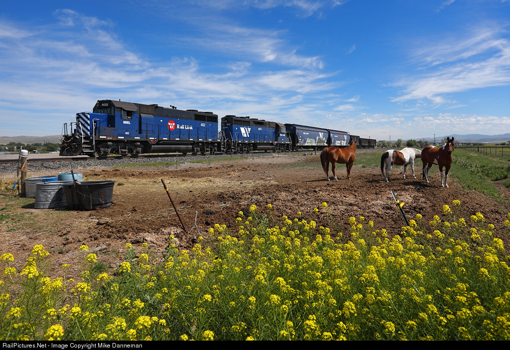 Montana Rail Link’s 844 local out of Logan heads westward on the Fifth Subdivision at Three Forks, Montana, on July 2, 2019. Today, the local is taking three empty ballast cars to the siding at Willow Creek, and will then make a trip up the Harrison Branch with the two covered hoppers. MRL No. 402 is an EMD GP35 that was originally a DT&I (later, Grand Trunk Western) locomotive that is not equipped with dynamic brakes.