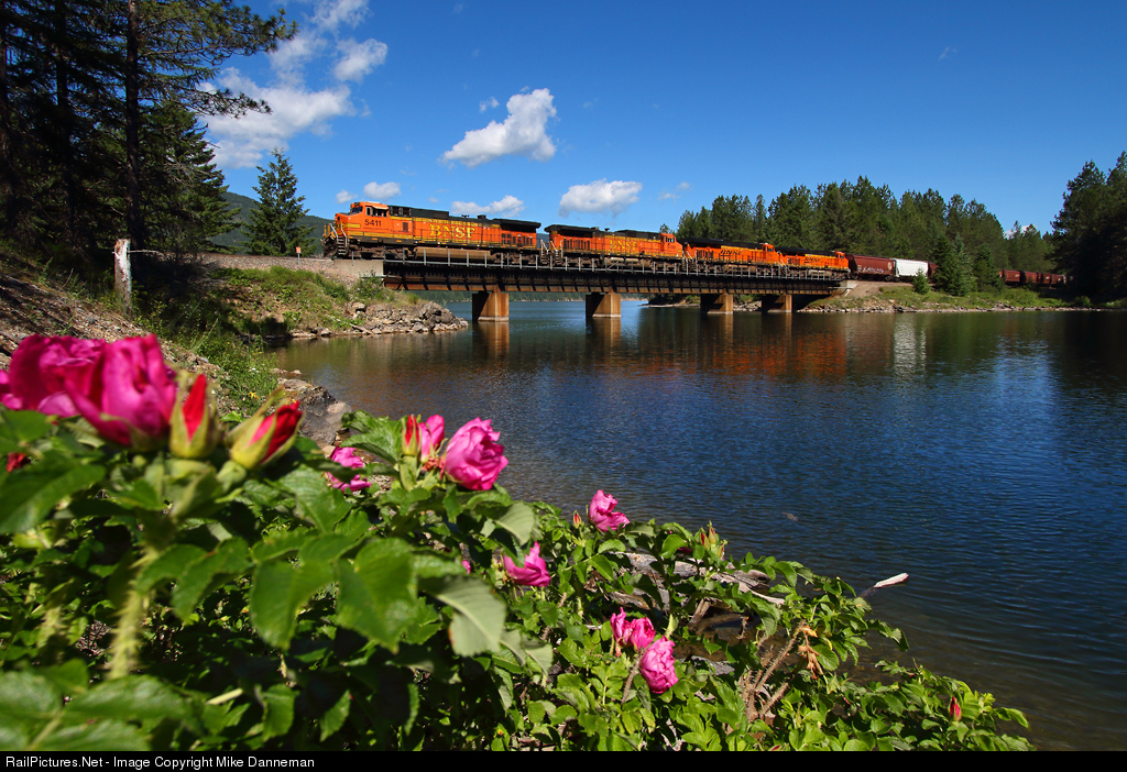 A BNSF grain empty crosses the Bridge 62 over the inlet of Swamp Creek into the Noxon Reservoir at Tuscor, Montana, on June 29, 2019. Some sort of variety of wild rose is blooming in the foreground along water’s edge, adding color to the early summer scene.