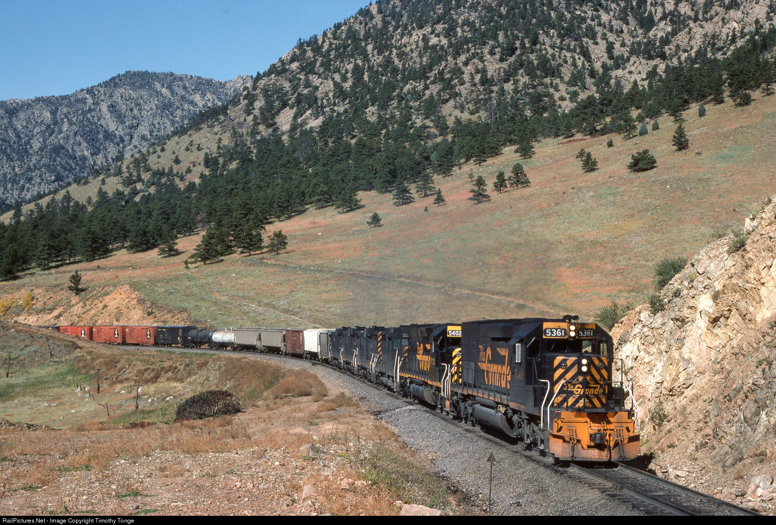 | DRGW 5351 leads westbound merchandise train #187 at Plainview, CO, just before entering Tunnel 1. Oct 10, 1982 |