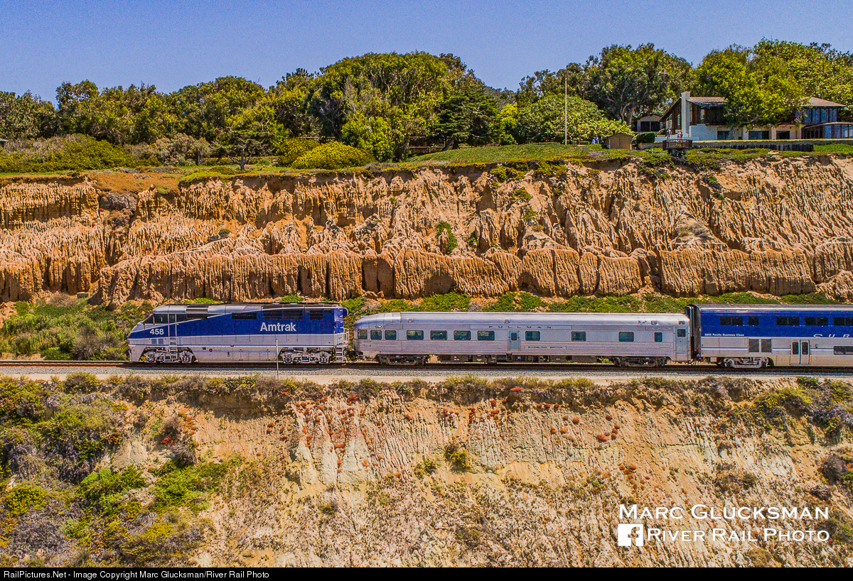 Riding on the edge. Amtrak 458 (EMD F59PHI) trails next to the Webb Rail LLC - WEBX observation/lounge/sleeper former New York Central "Babbling Brook" on Sunday, August 20, 2017 as it hugs the cliff while passing Sunset Seat in Del Mar, California. The car is riding Train 768, and as such had to ride behind the engine as all Pacific Surfliner trains have controls at each end. While the "Babbling Brook" remains with Webb Rail, Amtrak 458 has since been sold to METRA in Chicago, IL to continue its career.