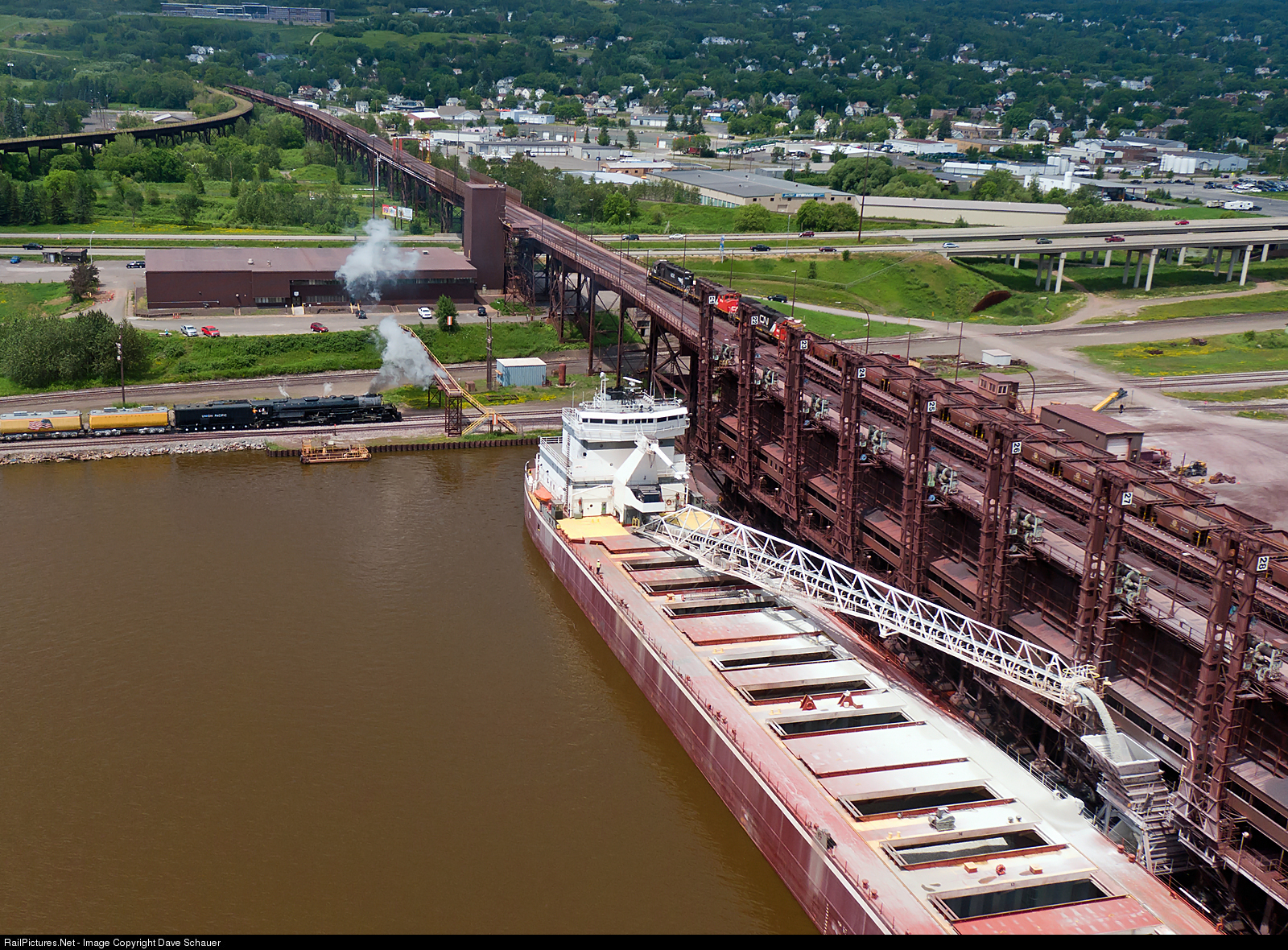 Not many things can make a UP Big Boy look small, but the Great Lakes vessel Joseph L Block sure does. The 4-8-8-4 was backing its train toward a wye in West Duluth as the Block unloaded limestone and a CN ore train sat tied down on top of the dock.
