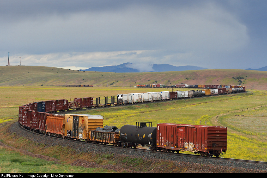Waiting for apposing traffic, an eastbound BNSF coal train sits in the siding at Winston, Montana, in the background as a westbound BNSF manifest freight grinds by, filling the curves on the approach to the top of Winston Hill on June 25, 2019.