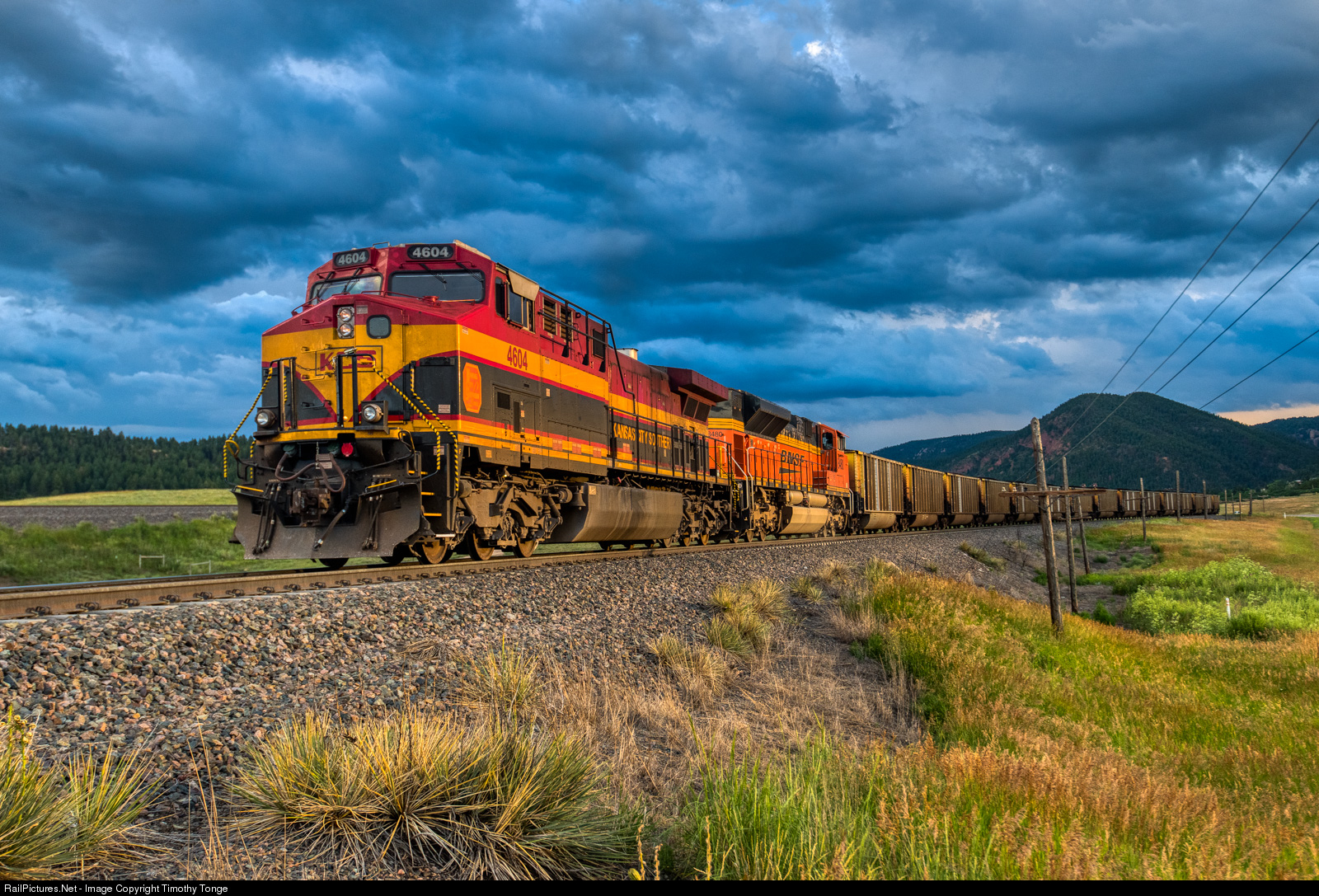 | KCS 4604 is the rear DPU on a southbound BNSF coal load, on a stormy day just prior to sunset. Palmer Lake, CO, July 23, 2019 |