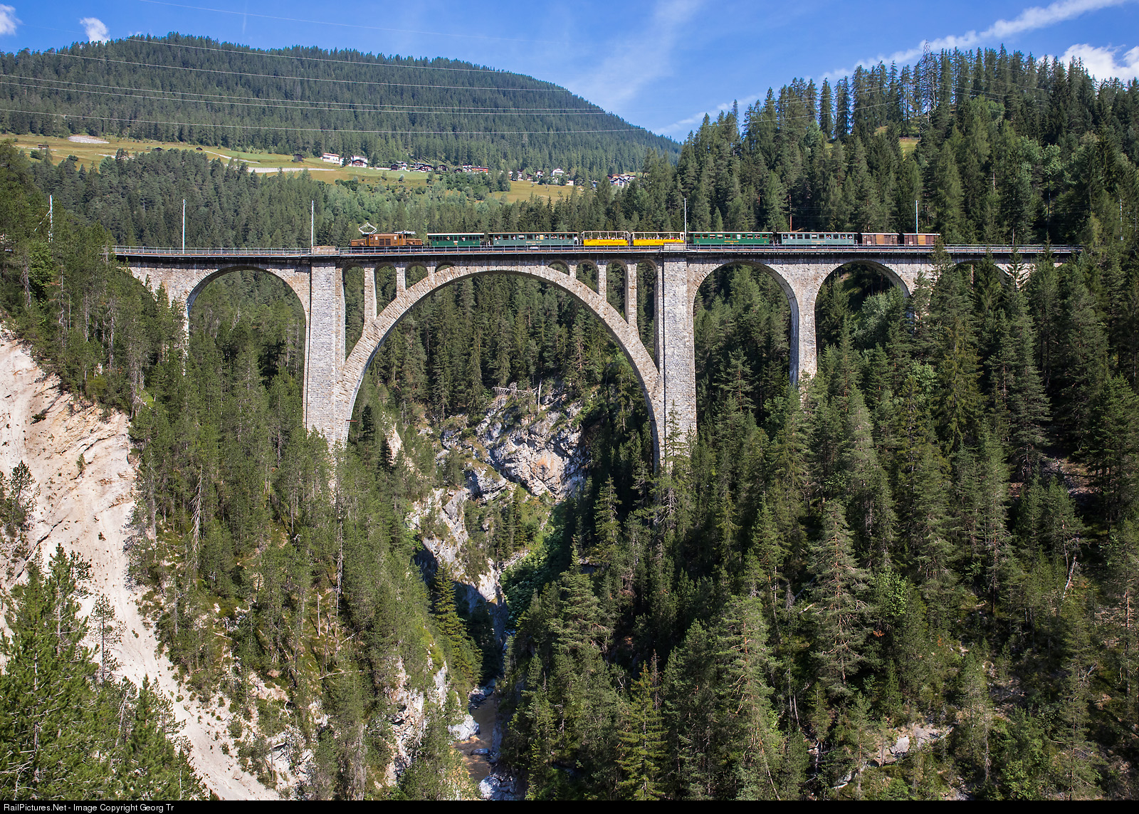 The nostalgic, timetabled Zügen gorge train 1815 from Davos Platz to Filisur is crossing the 89 meter high and 210 meter long Wiesen viaduct, the highest on the Rhaetian Railway network and the second highest railway viaduct of Switzerland. This impressive viaduct with a parabolic bow of 55 meter main span, crossing the Landwasser river, was built between 1906 and 1908 mainly with concrete blocks and faced with granite and gneiss stones. The "Rhaetian Crocodile" or "C-C" (according the axle configuration) Ge 6/6 I # 415 from 1929 is pulling the following cars: First class A # 1102 from 1903, second class B # 2247 from 1932, 2 yellow open observation cars "carrozza panoramica"/"Aussichtswagen" B # 20../#21.., second class B # 2246 (with new paint) from 1932, second class B # 2245 from 1928, covered freight cars/baggage cars D2 # 4080 and # 4079 for bycicles, buggies etc. This train is circulating twice a day in both directions during the summer, with slightly changed times, replacing a timetabled train with modern vehicles. The Landwasser creek has a very strange color this day, brown-yellow. In the background is the village Wiesen, about 250 meter higher then the railway station Davos Wiesen, which is just on the right of the viaduct.