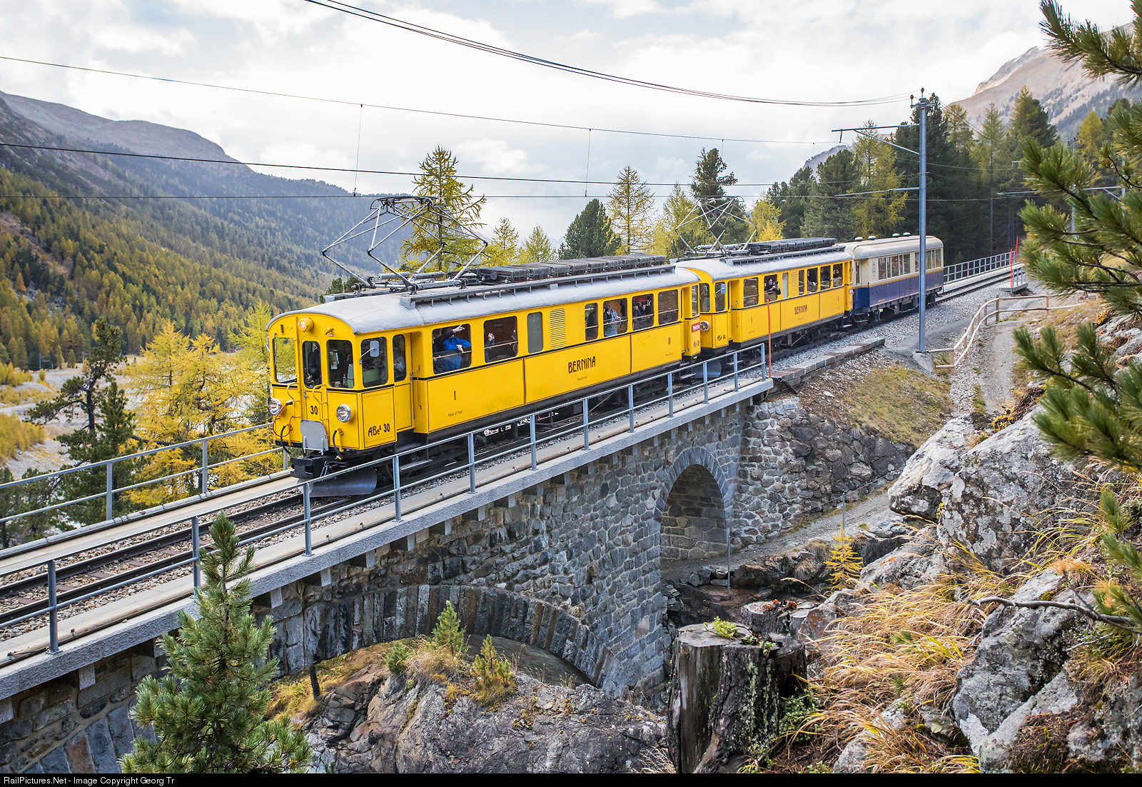 Historic railcars ABe 4/4 # 30 and # 34 of the RhB, built in 1911/1908 for the then independent Bernina Railway, are running over the Ova da Bernina creek bridge between Bernina Suot and Morteratsch, with Piano/Bar car WR-S # 3820 from 1928 (rebuilt).