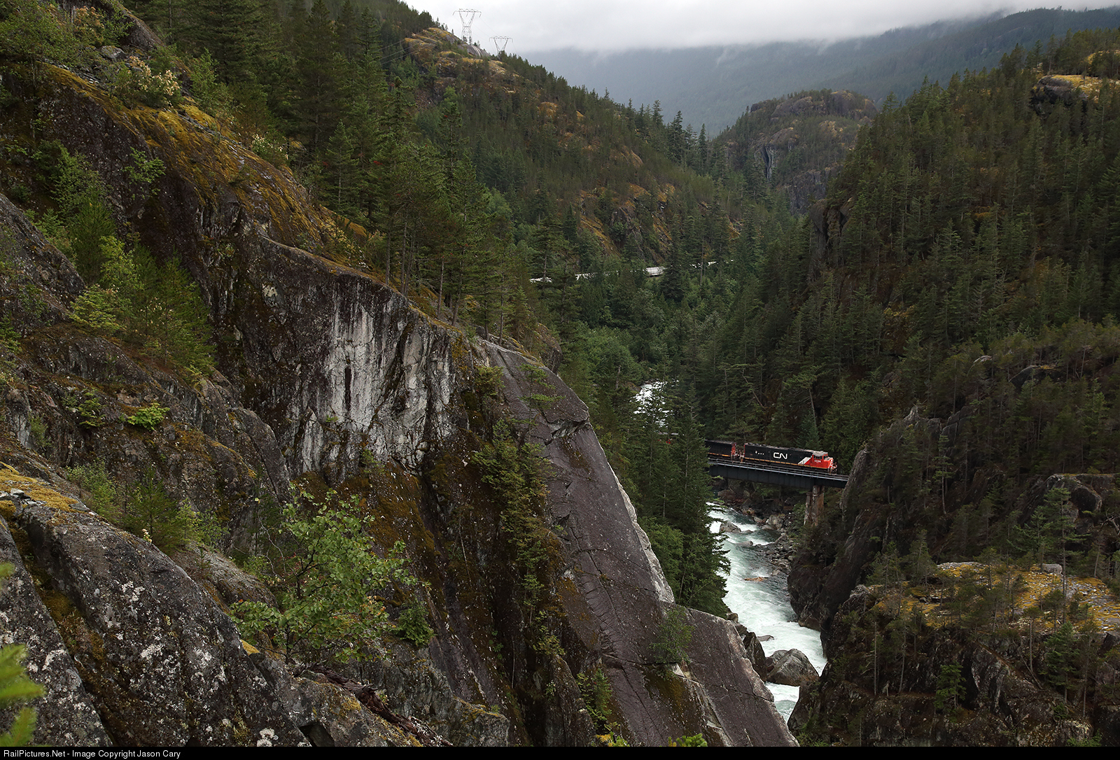A northbound Canadian National 571 crosses the Cheakamus River on a rainy afternoon. The narrow defile is a popular location for rock climbers who love to scramble up the steep slippery moss covered slopes.