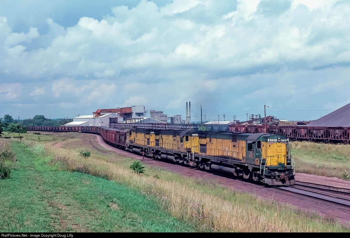 Class unit 6701 and two other Chicago & North Western C628’s arrive at Escanaba, Michigan with a train of ore from the north.