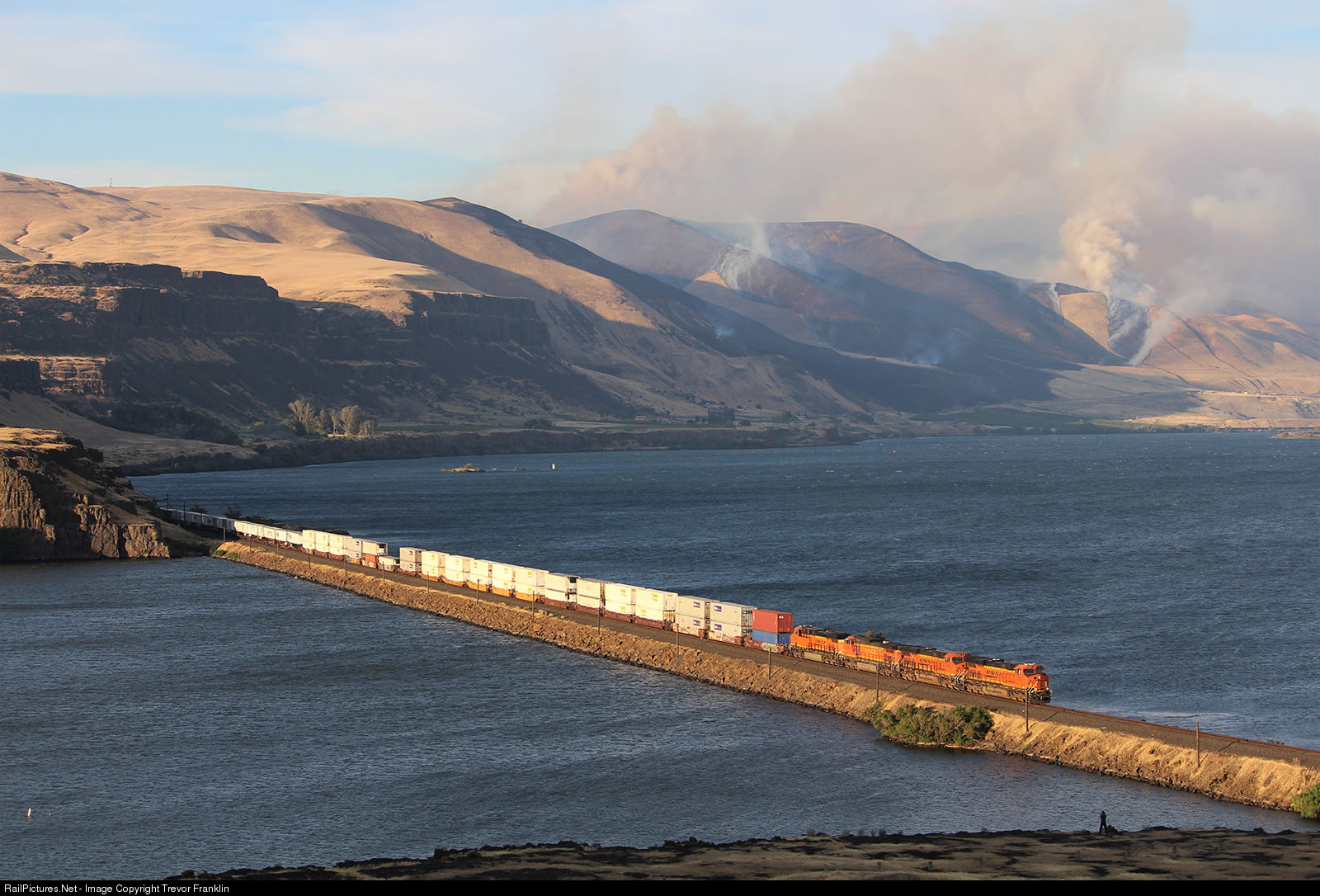 Four GEs hustle priority intermodal traffic past the Horsethief Lake campground at sunset in Columbia Hills State Park, WA. The dry climate in the Columbia River Gorge has stoked brush fires which have engulfed the surrounding hills, closing the Lewis and Clark Highway in the process. The trains roll on though, with grain loads on the Z-train's heels after both held for the eastbound Empire Builder.