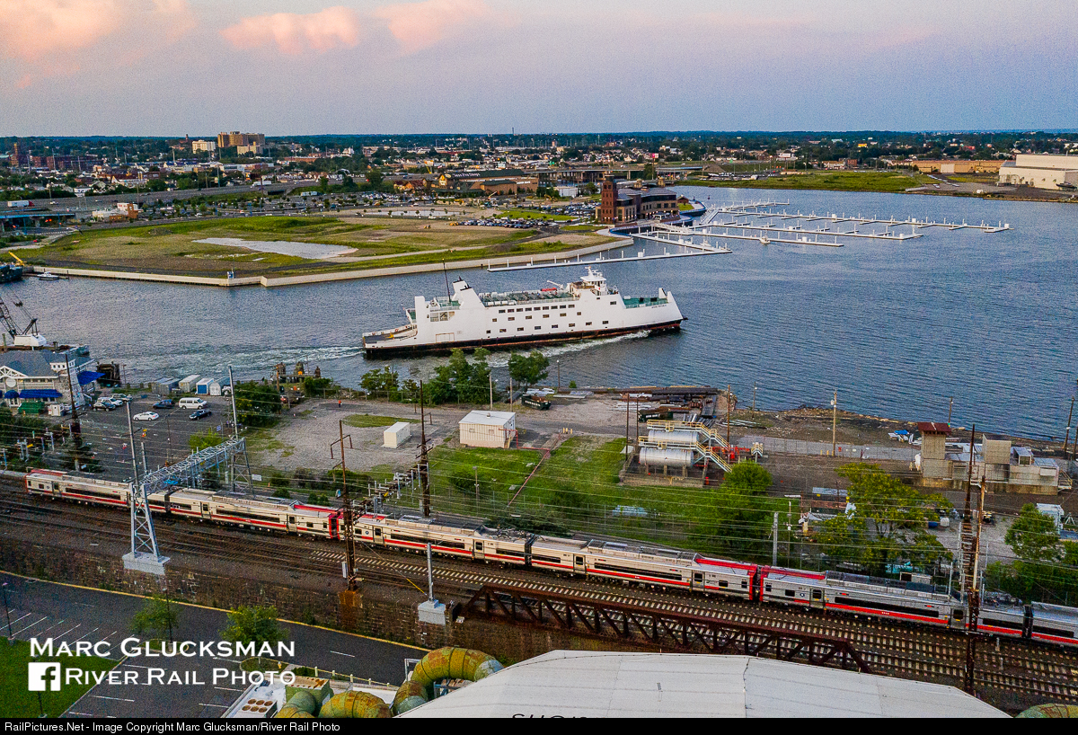 | An evening departure of the Bridgeport & Port Jefferson ferry coincides with a passing MTA Metro-North Railroad train in Bridgeport, CT on a typically sweltering summer evening. |