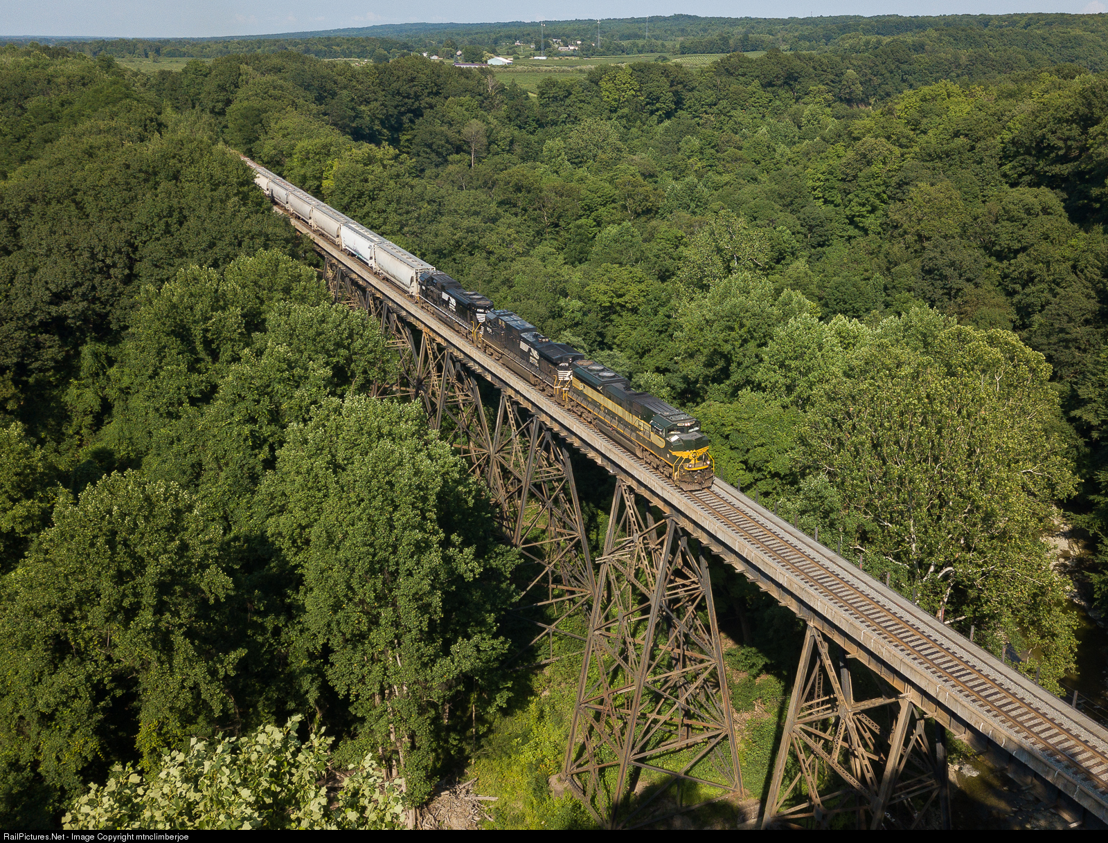 Norfolk Southern's Erie Railroad heritage unit is on the point of westbound manifest freight 309 as it crosses the trestle over Twentymile Creek. The train has just crossed the NY-PA state line as it traverses former Nickel Plate trackage.