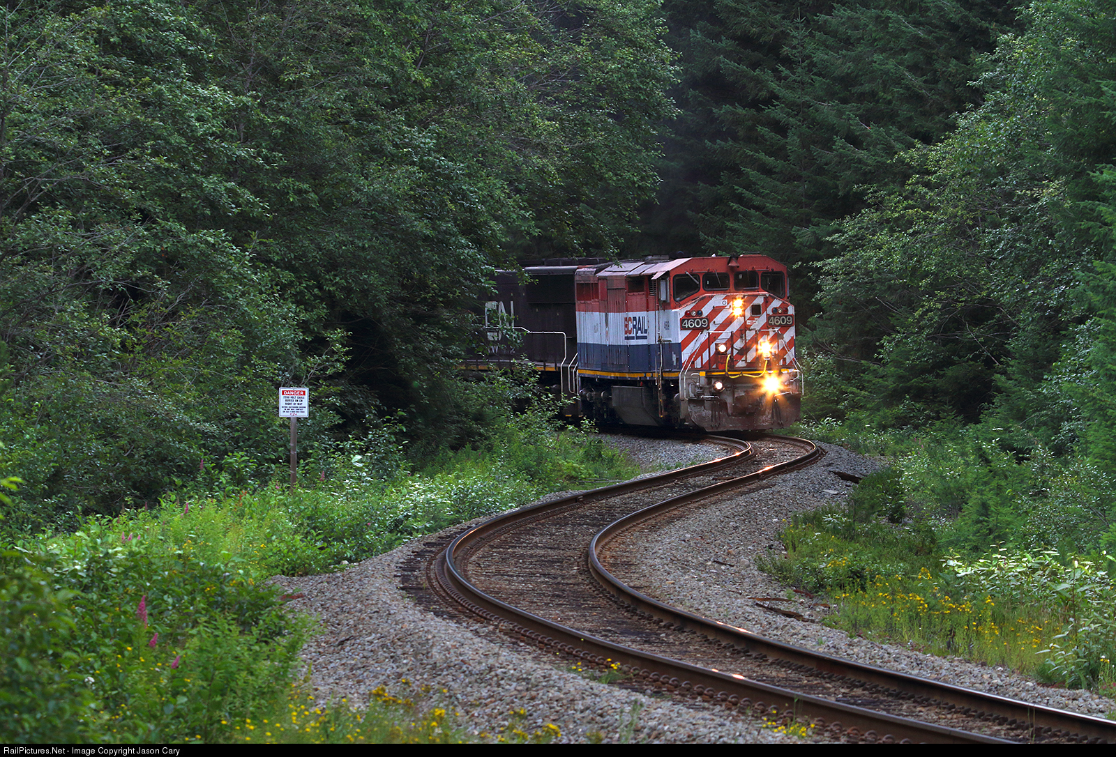 BC Rail 4609 screams into the 10 degree curves on Pemberton Hill. The Red, White and Blue locomotive was built in 1990 to move heavy trains of mineral and forest products over the grades of the BC Rail. If rumors hold true these gorgeous cowl units will soon be retired....
