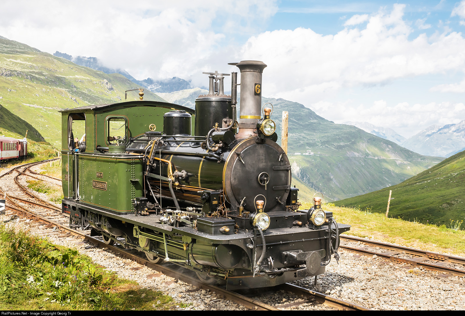 | Cogwheel steamlocomotive HG 2/3 # 6 "Weisshorn" of the Dampfbahn Furka Bergstrecke (DFB), built in 1902 by SLM Winterthur for the Visp-Zermatt-Bahn, in Furka DFB station. The locomotive arrived with train 158 from Gletsch and was turned on the turntable already. This type of locomotive has to run downgrade with the chimney towards the mountain, according to the boiler construction. |