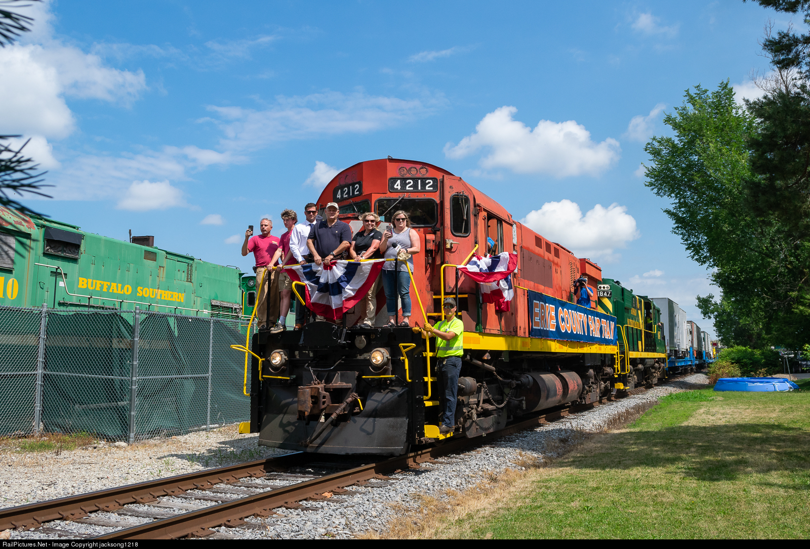 With the Erie County fair committee on board the front of the locomotive, BSOR 4212 proceeds slowly past the Buffalo Southerns shops and yard in Hamburg NY.
