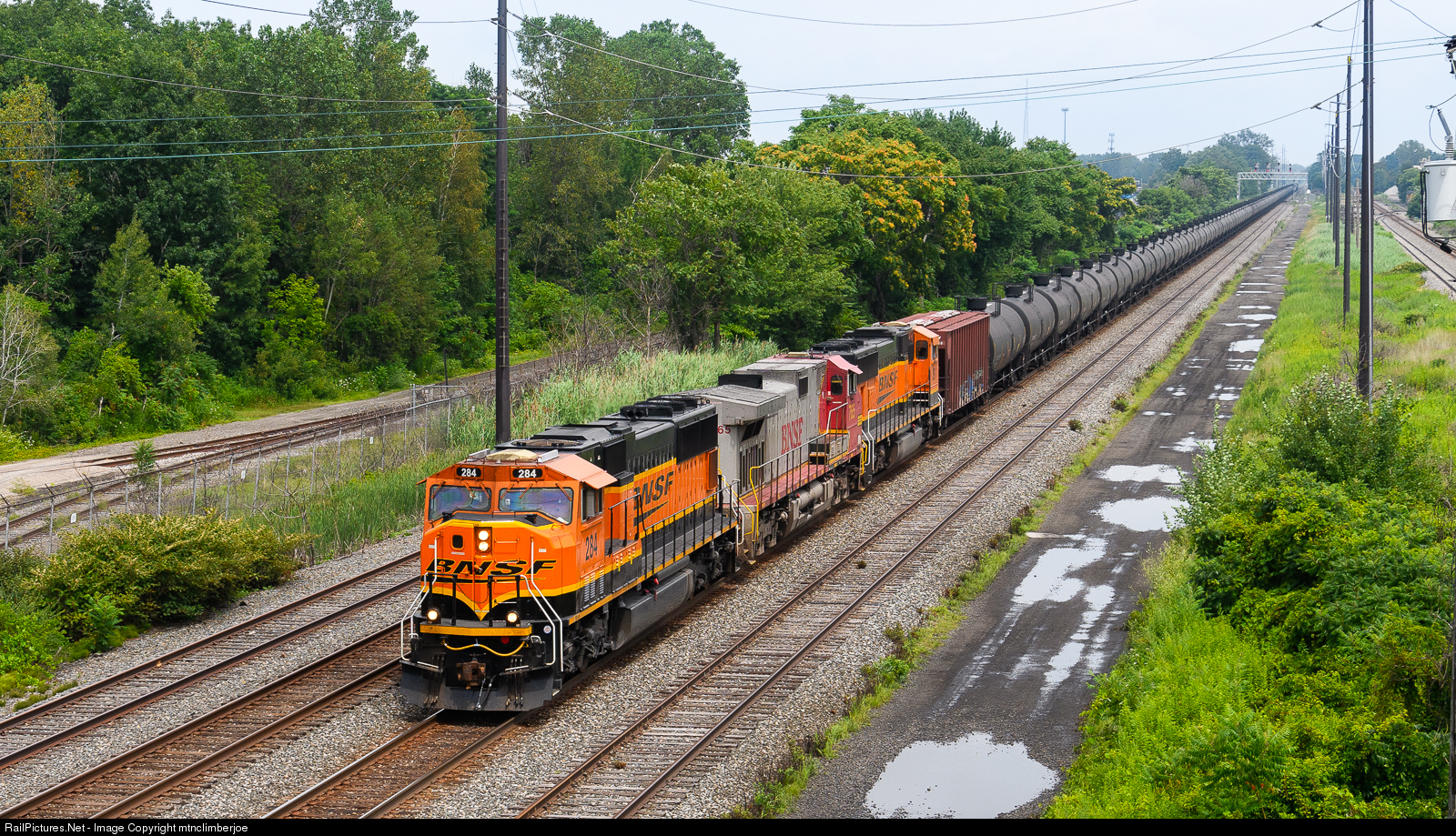 | A trio of BNSF locomotives consisting of two SD75's and a warbonnet Dash 9 pull empty CSX oil train K161 through Erie, Pennsylvania westbound to return to the oilfields for another load. |