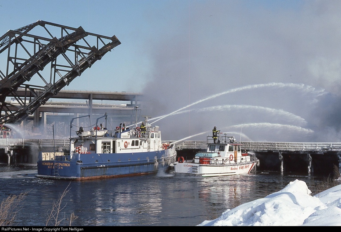 On January 20, 1984, a predawn fire destroyed the wood pile trestle approaches to the Charles River drawbridge outside Boston's North Station, cutting off access to the station for 15 months while the bridge was rebuilt with concrete. In the morning, MassPort and City of Boston fireboats were hosing down the smoking pilings. During the year-plus that it took to restore service to North Station, shuttle buses took passengers to a temporary station on the far side of the bridge.