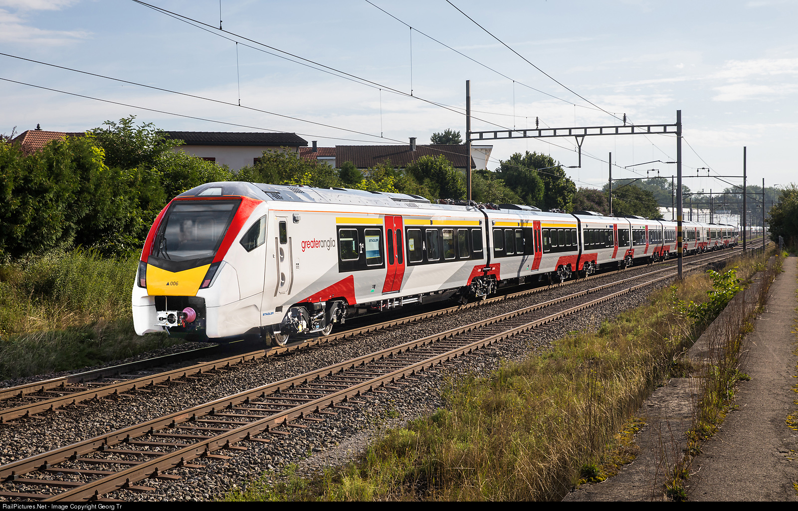 | 237 meter long electric 12-car "Flirt" EMU12 class 745/0 from StadlerRail for the Abellio Greater Anglia (East Anglia Franchise) # 94 70 0312 006, in Erlen. The Re 620 # 043 pulled the train first from Erlen via Romanshorn to Konstanz for costume clearance, then via Romanshorn-Winterthur-Bülach to Basel Bad Bf for delivery to the UK. 10 of this trains will run between London Liverpool Street station and Norwich from this year. 10 further similar trains class 745/1 will run between London and Stansted Airport. |