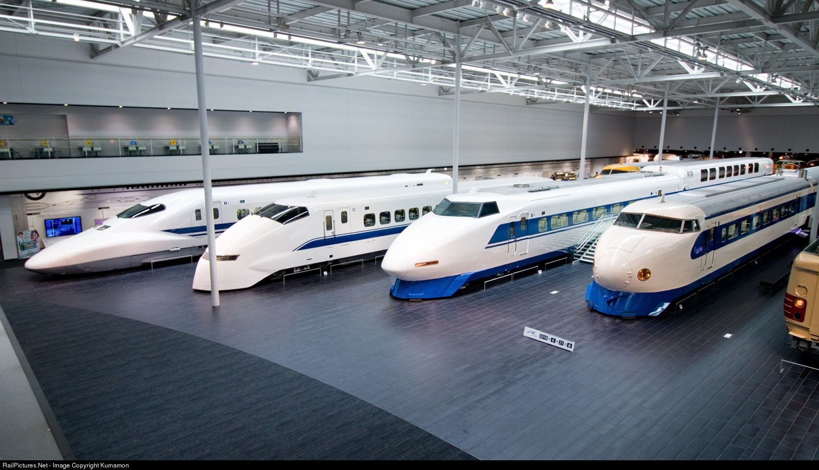 4 generations of Shinkansen trains standing side by side at the SCMAGLEV and Railway Park museum in Nagoya.