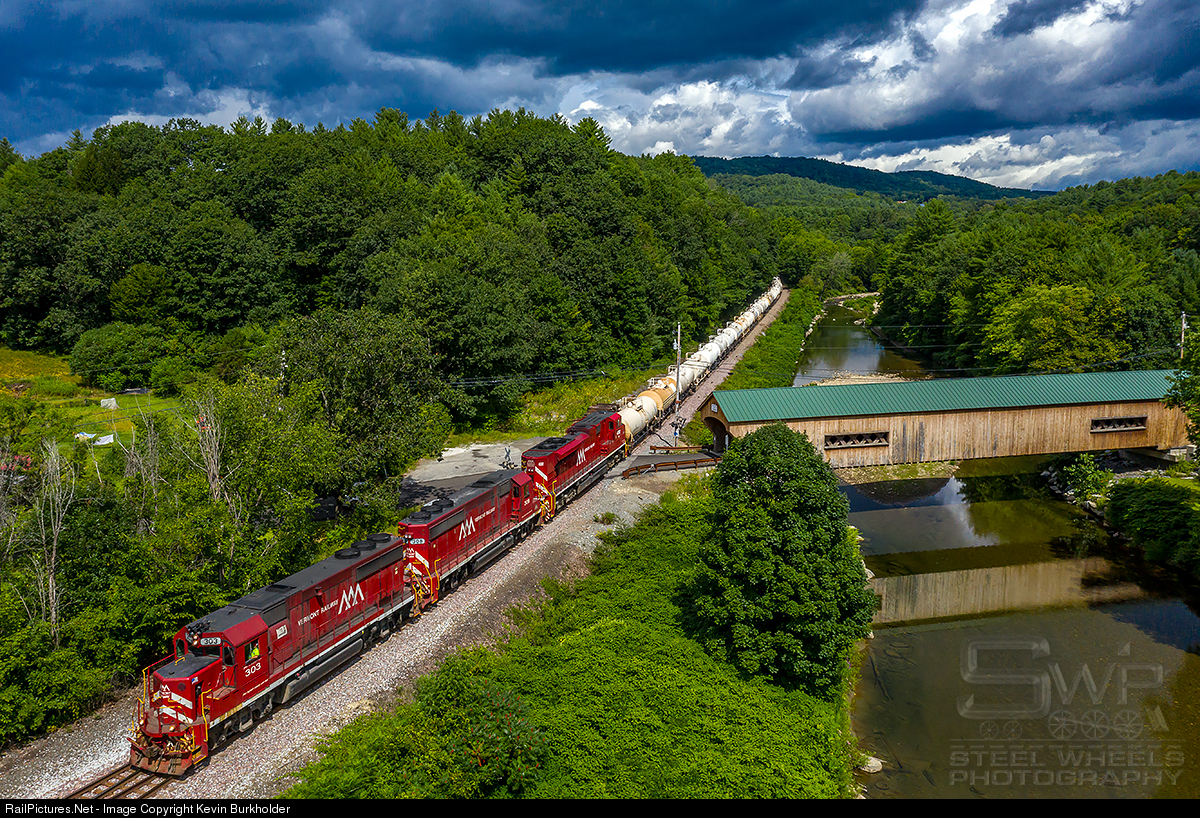 | Vermont Rail System's Saturday slurry train 263 timed its arrival at the Bartonsville Covered Bridge on August 10, with a well placed and brief period of sunshine. With a Vermont Railway trio in charge, ex-B&M GP40-2 duo now VTR 303 and 308 and SD70M-2 432, the train and bridge make this a very Vermont scene. |