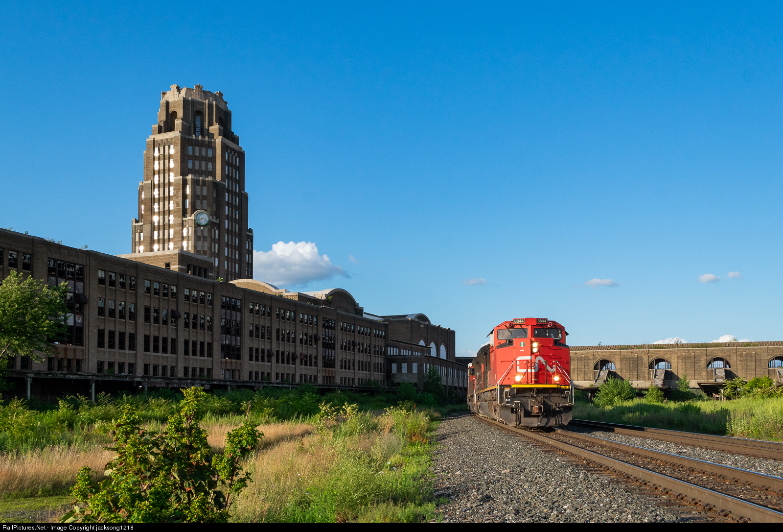 CN interchange 531 lead by CN SD70M-2 number 8844 passes the derelict Buffalo Central Terminal on a sunny Saturday Evening. While some improvements have been done to the inside of the building, the outside still remains in terrible shape and open to the weather.