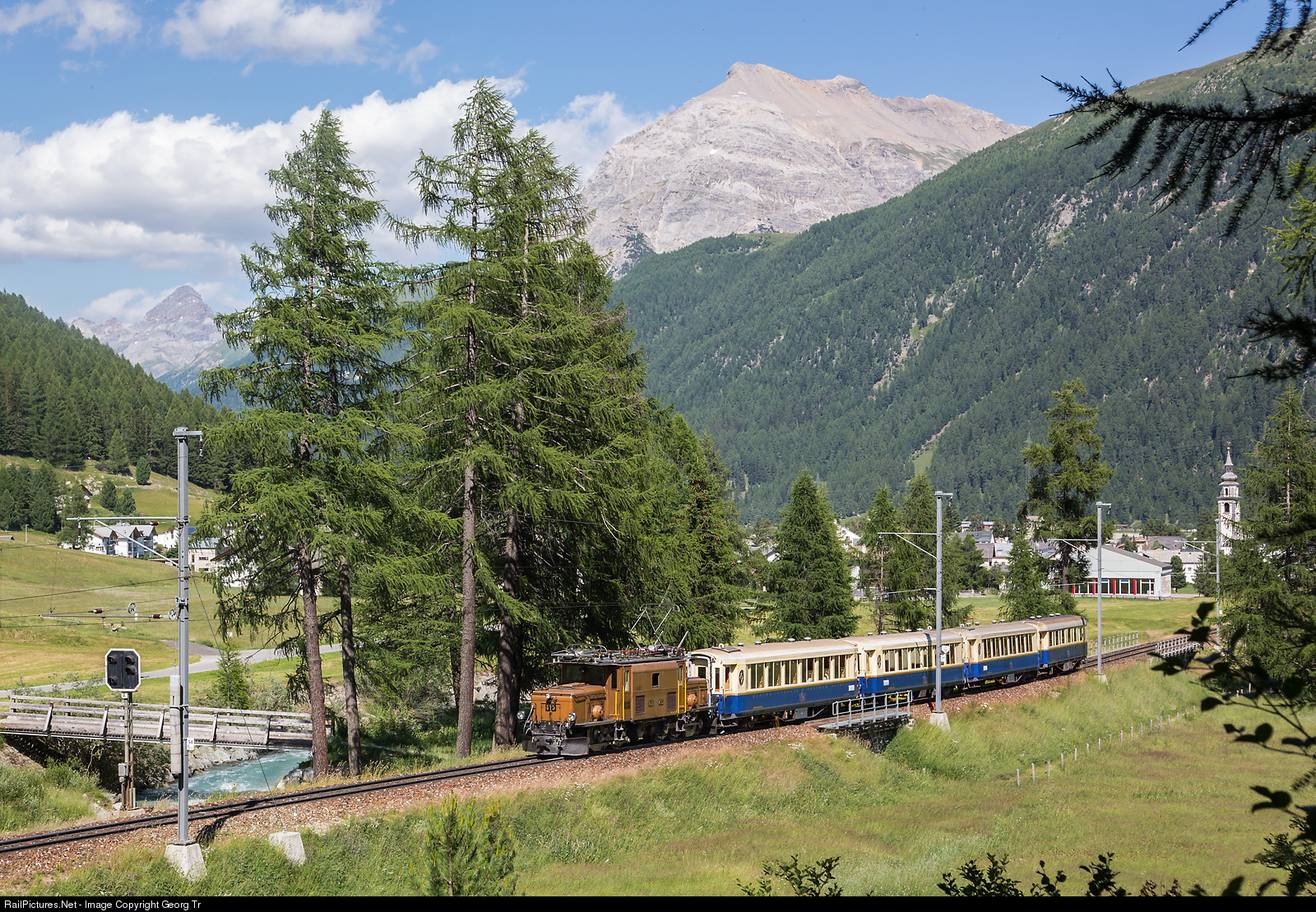 | "C-C" or "Rhaetian Crocodile" Ge 6/6 I # 415 with the "Rhätia Pullman Express" 2156 from St.Moritz to Davos in the Val Bever, including Piano Bar WR-S # 3820 (built in 1928 as saloon/dining car for the Bernina line) and three saloon cars from the As # 1141-1144 series "Alpine Classic Pullman Express" from 1931. In the background Piz d'Esan (left) and Piz Mezzaun. |