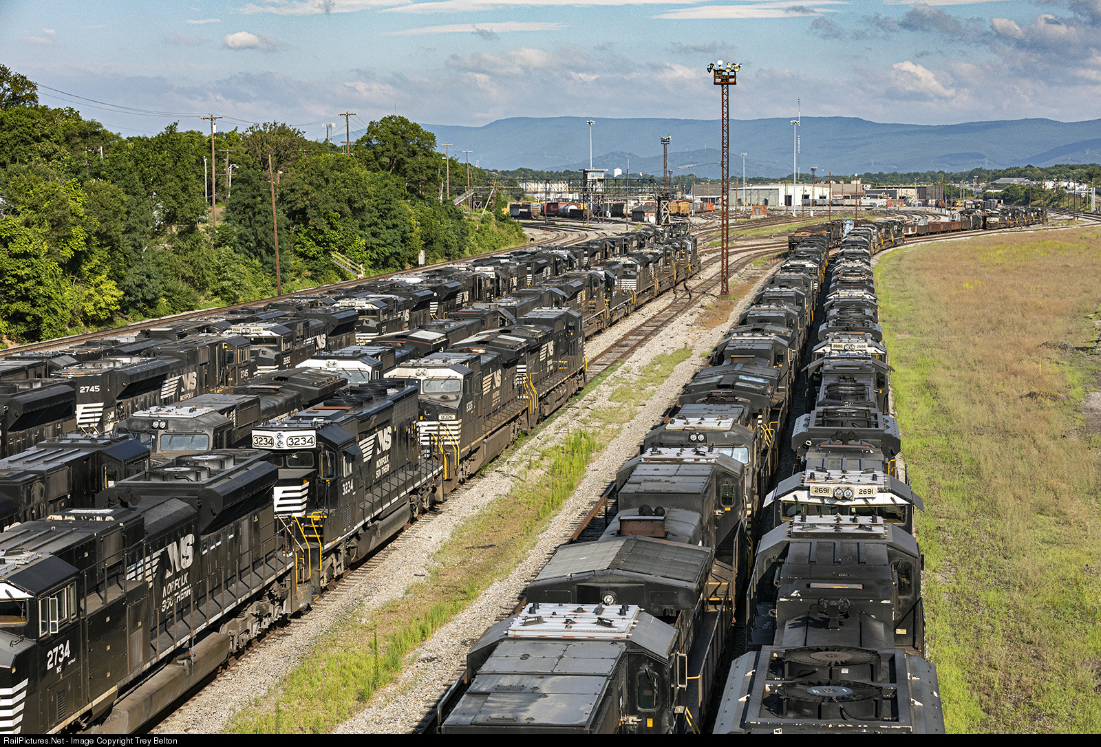 | More stored power rests on the West side of the 10th Street bridge in Roanoke. The lines of locomotives are a continuation of the photo that was submitted and became a Top Shot the week of August 5th 2019. This is the photo looking at the east side from the bridge. https://www.railpictures.net/photo/705484/ |
