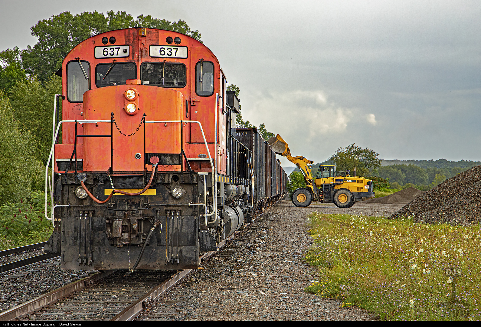 WNYP M636 NÂș637 is on the north end of this Turtlepoint bound stone train which is being live loaded at Machias, New York on August 6, 2019. After loading is completed both units, one from each end will be placed together for the run south.