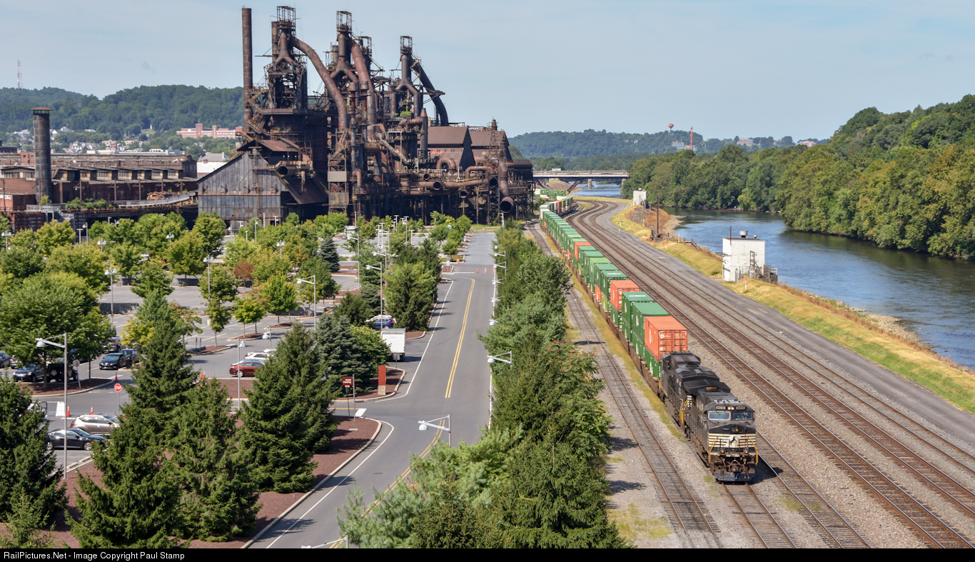 NS 9406 leads and east bound intermoadal past the once mighty Bethlehem Steel Mills.