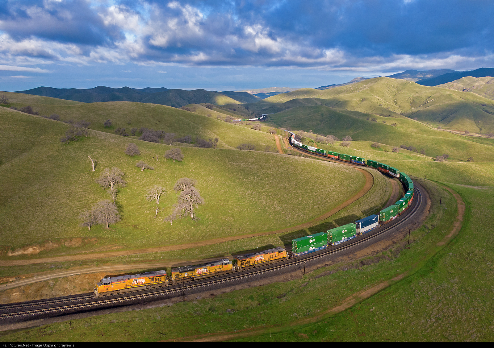 | An eastbound Union Pacific intermodal train is climbing and curving through Bealeville, CA while dodging clouds on a gorgeous Feb 18, 2019. |