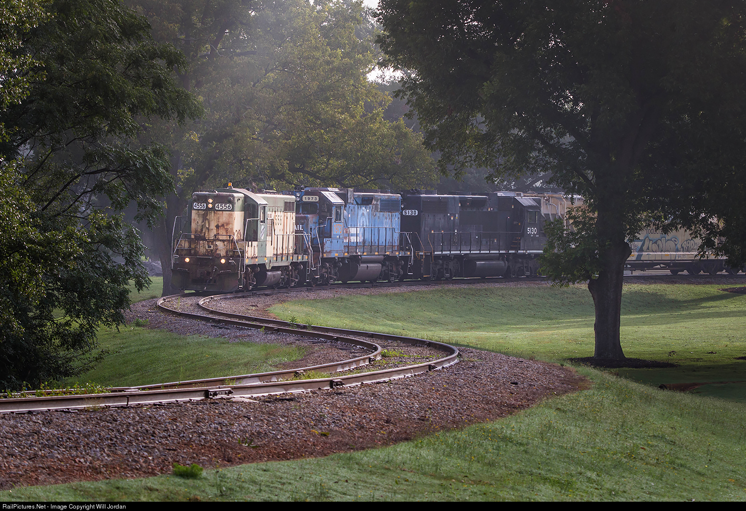 With the morning fog burning off, the Hartwell job shoves up the serpentine lead to Pharma tech Industries in Royston, Georgia with a couple out of place locomotives for power.