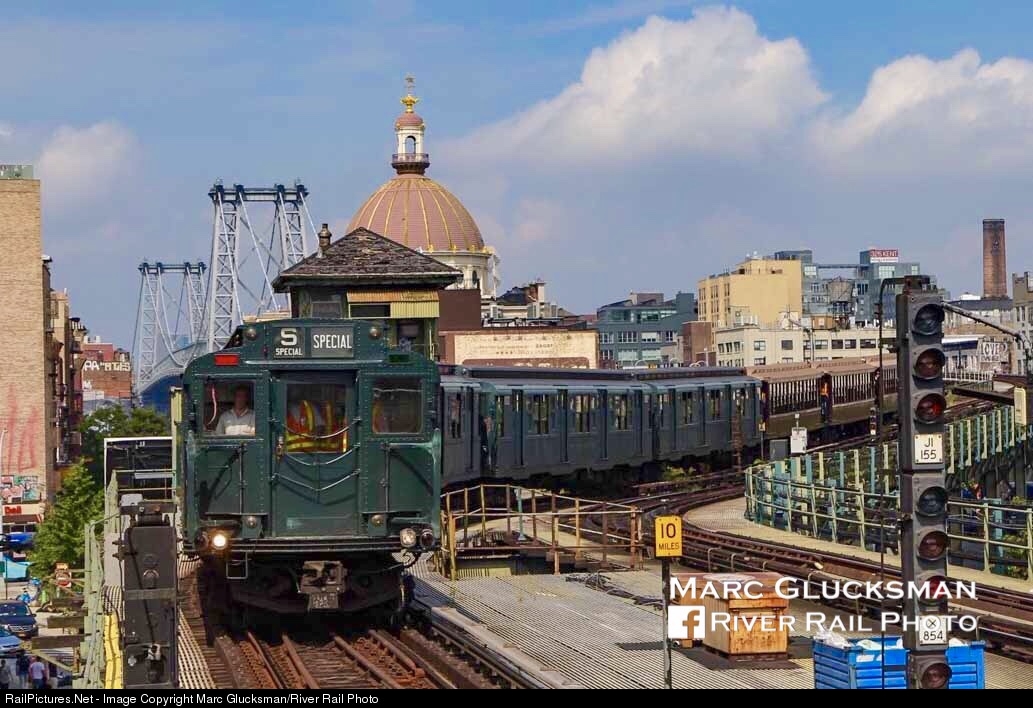 | Celebrating a sad anniversary. It has been 50 years since service ended in the Myrtle Avenue Elevated in 1969. The MTA New York City Transit Subway/New York Transit Museum operated a special across the eastern division of the BMT on Sunday, August 18, 2019. Looking out towards the Williamsburg Bridge, the combined train of R9s and wooden elevated cars approaches the Marcy Avenue Station. The trains would cut apart and run separately throughout the afternoon. |