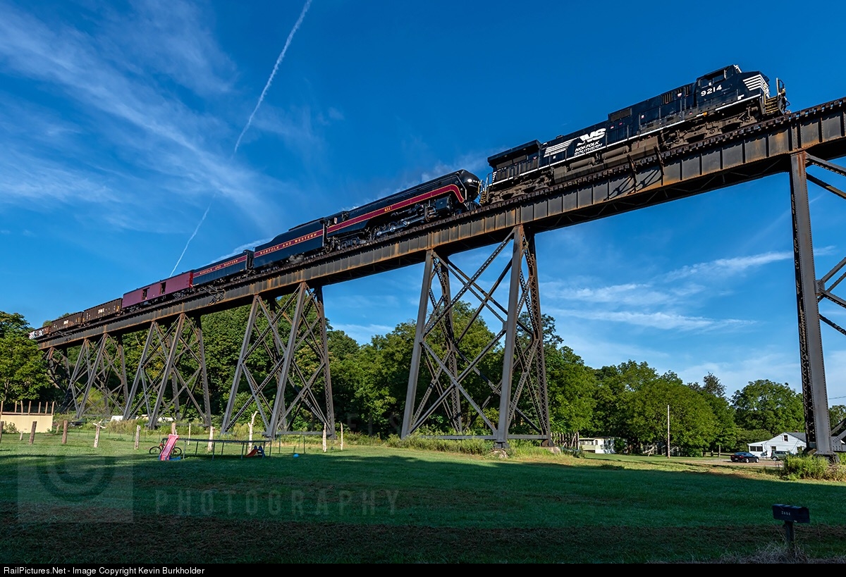 On August 19, the Virginia Museum of Transportation’s 4-8-4 steam locomotive, N&W 611, began its trek to Strasburg, PA, behind NS C40-9W 9214. The 611 and support equipment were supposed to be in Enola, PA late this evening, however it appears that it will be an early am arrival. Train is seen crossing the trestle just north of the town of Troutville, VA.