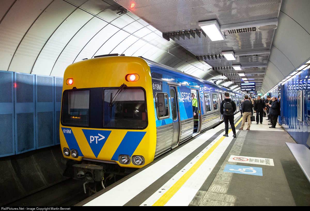 A Comeng set pauses at Parliament station in Melbourne's underground City Loop, with a service to Sunbury. As you might guess from the name, Parliament station is located right next to the Victorian state Parliament House. You can watch some video I shot at this station here: https://youtu.be/boaDlffzljE