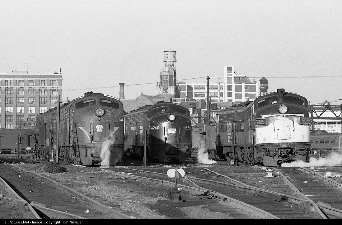 Within weeks of Penn Central's takeover of the New Haven, ex-PRR E8s began to take over Boston-New Haven passenger runs from the NH's own FL9s. A year after the merger, sets of FL9s and E8s in three color schemes posed at Dover Street yard in South Boston on a winter day.