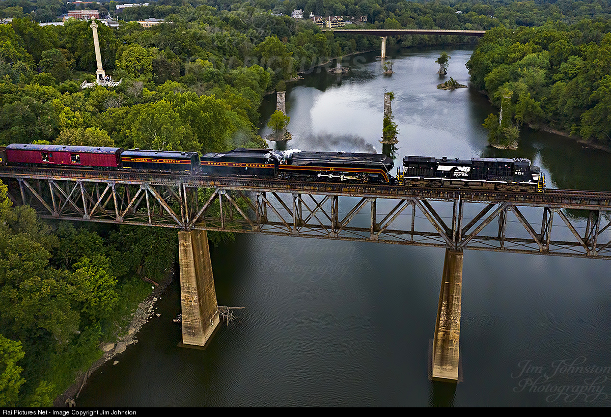 | The Virginia Museum of Transportation’s 4-8-4 steam locomotive, N&W 611, crosses the Potomac River crossing from West Virginia into Maryland northbound. Although under steam the NS 9214 piloted the 611 for its journey towards Harrisburg and ultimately Strasburg, PA. |