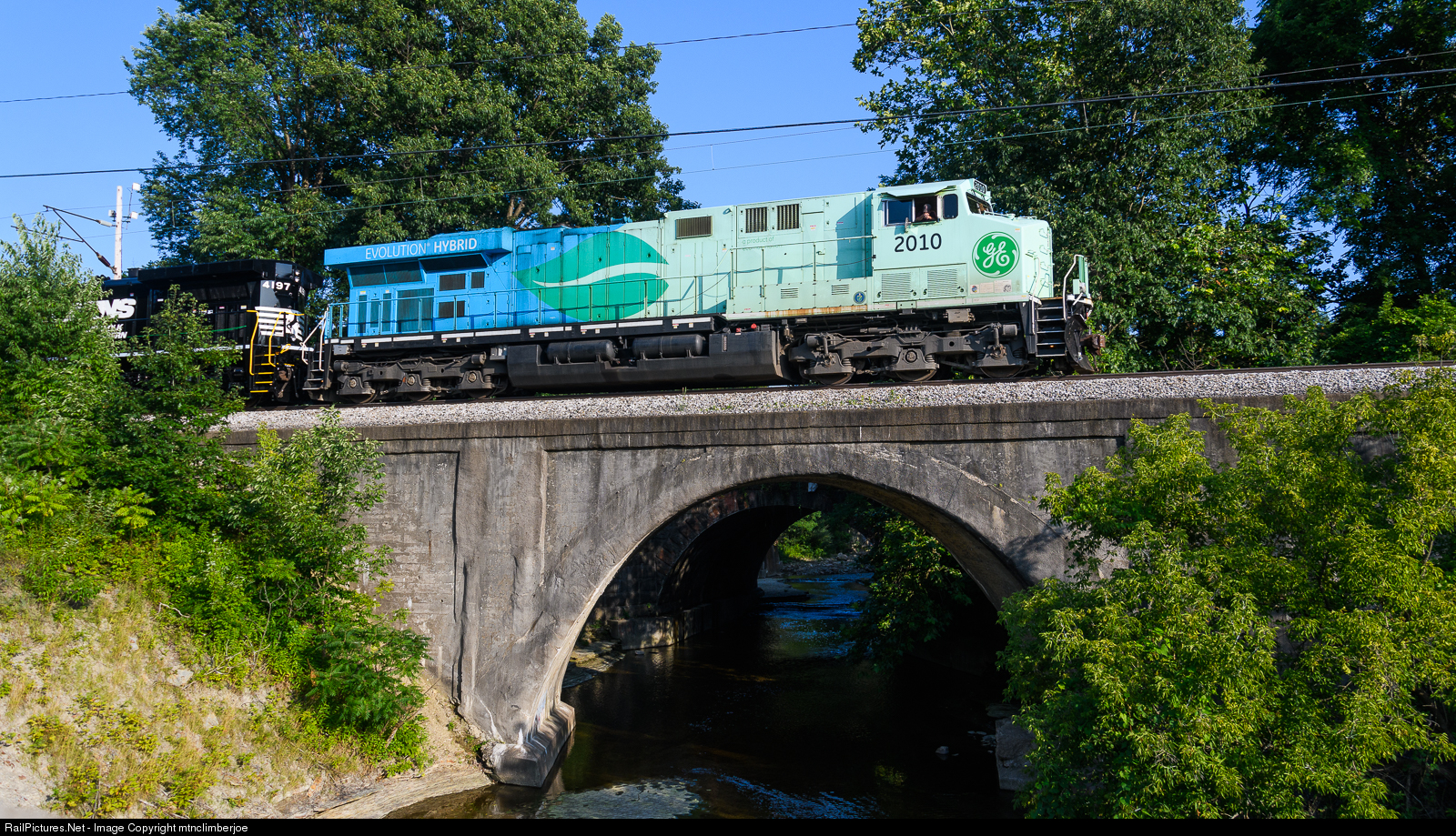 GE ES44AC demonstrator 2010 is on the point of a test train at GE Transportation, a Wabtec Company's Erie Plant test track. The train is crossing over Sixmile Creek with two GE modernization units in tow for testing.