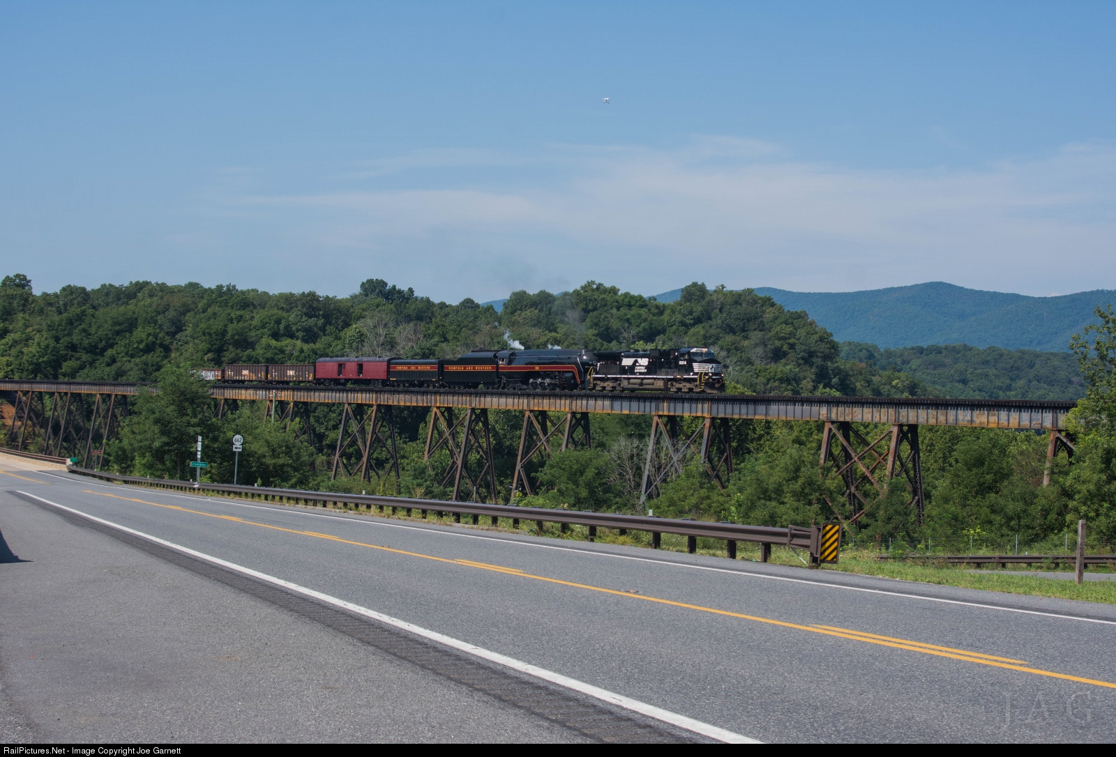 | After running into 10+ hour delays the day before, N&W J-Class 4-8-4 #611's ferry move from Roanoke to Strasburg, PA is back on the move on the morning of August 20th. Seen here crossing the famed Compton Trestle just a few miles north of Luray, this move marked the first time a steam locomotive ran the entire length of the 'Valley Line' since 1957. |
