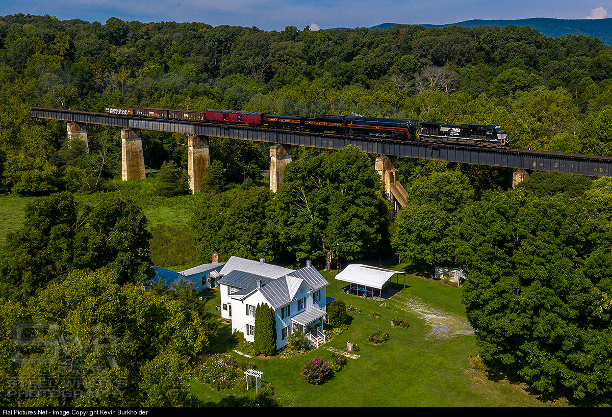 After delays on August 19, the Virginia Museum of Transportation’s 4-8-4 steam locomotive, N&W 611, restarted its trek to Strasburg, PA, behind NS C40-9W 9214 fro Shenandoah, VA. The 611 and support equipment arrived in in Enola, PA late last night. Train is seen at Rileyville, VA on August 20.