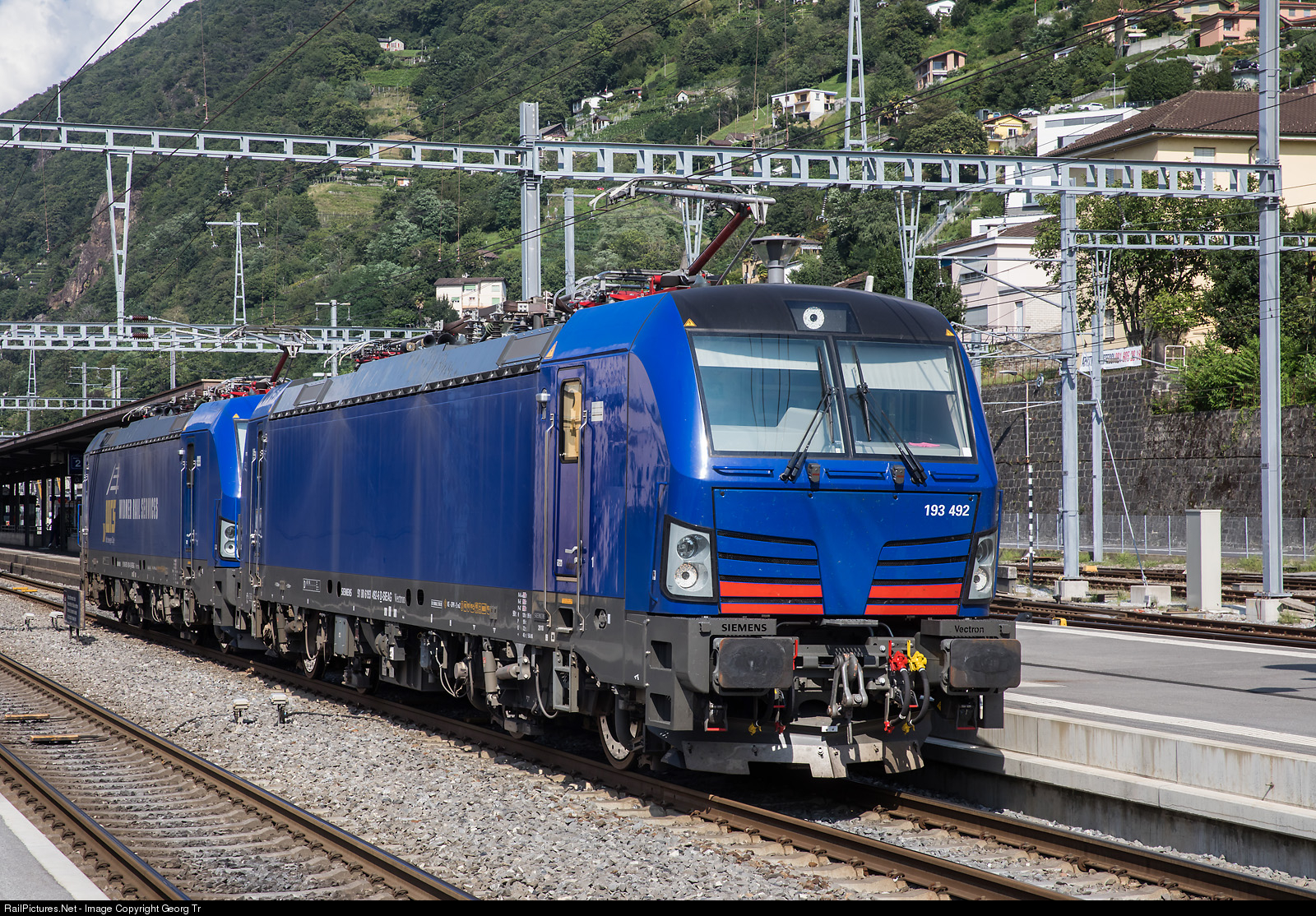 | Siemens "Vectrons" 193 # 492 and # 493 of the Hupac company, both rented to Widmer Rail Services (WRS), running through Bellinzona bound for Mendrisio. The locomotive in the rear has the WRS inscription/logo on the sides. |