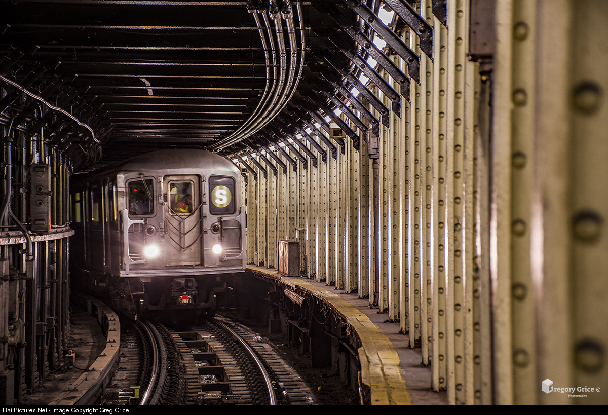 "The Curved Track 3 Platform at Times Square" One of the three 42nd Street Shuttle trains pulls into the extremely curved platform on Track 3 at Times Square. Opened in August of 1918, the 42nd Street Shuttle runs between Times Square & Grand Central on part of the original IRT subway which first opened in October of 1904. Many aspects of the original subway could still be seen, but on the night of August 16th, 2019, construction work began that would drastically change the Shuttle. A majority of the work on the Times Square side involves eliminating all of Track 3 (pictured here), turning it into a huge island platform, walling off the original Track 4 platform and removing the bridgeplates that takes passengers over to the current Track 4 platform. When finished, this will allow for 2 six-car trainsets instead of the current 3 smaller trainsets, increasing capacity and make the Shuttle ADA compliant.