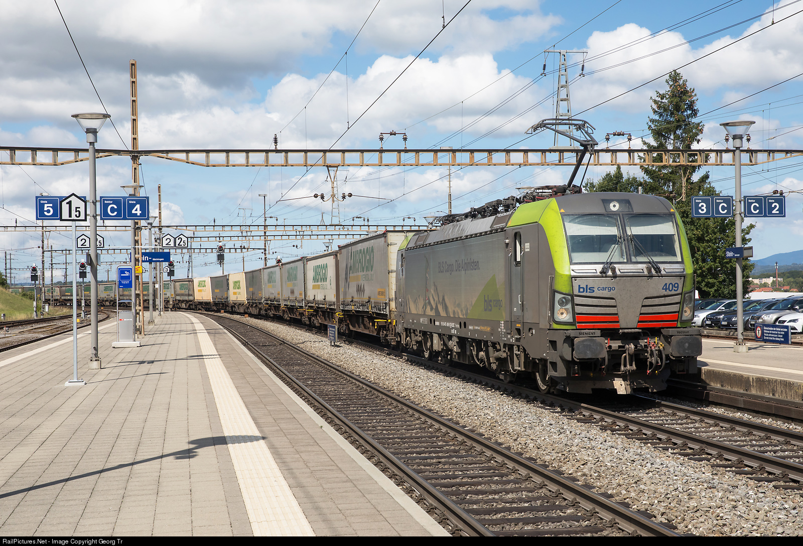 | Siemens Vectron Re 475 # 409 of the BLS Cargo is pulling the southbound Ambrogio intermodal train 40345 from Muizen (Mechelen)/Belgium via Bözberg and Gotthard Base Tunnel to Gallarate/Italy (Busto Arsizio Terminal), through Stein-Säckingen. |
