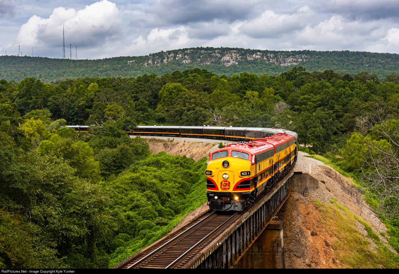 Kansas City Southern's trio of sleek EMD F9's bring an executive special through Cook Springs,AL on their way to Atlanta,GA on a hot a humid August morning.
