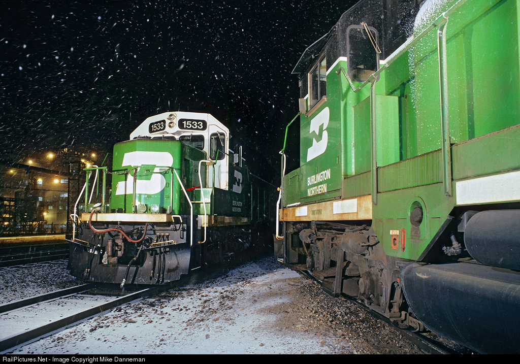 Burlington Northern locomotives that power locals out of Rochelle, Illinois, rest overnight during a snowfall on December 30, 1995. Both are extensively rebuilt EMD GP9s and are now called GP28Ms, and were remanufactured in 1993. BN Nos. 1533 and 1538 are former Northern Pacific GP9 Nos. 225 and 283 respectively.