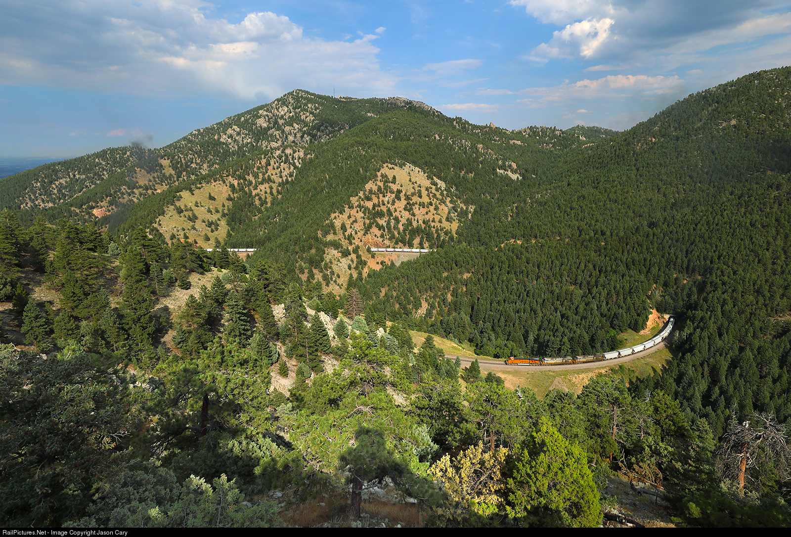 Part III Sand Train. The work of getting a tonnage train over the mountains can be a challenge in the best of conditions, when things are not working rite it becomes far worse. This westbound sand train is on its second attempt to make the climb thru the Tunnel District. The first attempt the train stalled at Tunnel 8 and had to back into Plainview. The conductor tied brakes on the rear to help control the speed on the back-up move. Working this mountain it is always safety first! Upon arrival at Plain, a very late Amtrak ran around the problem train. The conductor of the 11000 ton sand train reset the ailing SD70 Mac on the rear. After knocking off the brakes the crew decided to try the climb again. After a long wait the train finally passed my location here at South Draw in heart of the Tunnel District. The train moving past me never made more than 4 mph, the exhaust from the rear helper set can be seen rising near the location of Tunnel 13. On the approach to Crescent the train stalled a second time on the flange oiler. By this time the BNSF Denver-Provo manifest was comming up behind the sand train and stopped at Tunnel 13. Eastbound Amtrak now was approaching Crescent. Due to train makeup the manifest could not shove the sand train. The decision was made to back the manifest to Rocky. The sand train would then back to Plainview a second time, and wait for two rescue locomotives out of Denver. Mountain Railroading!